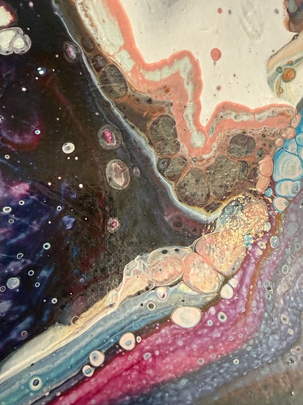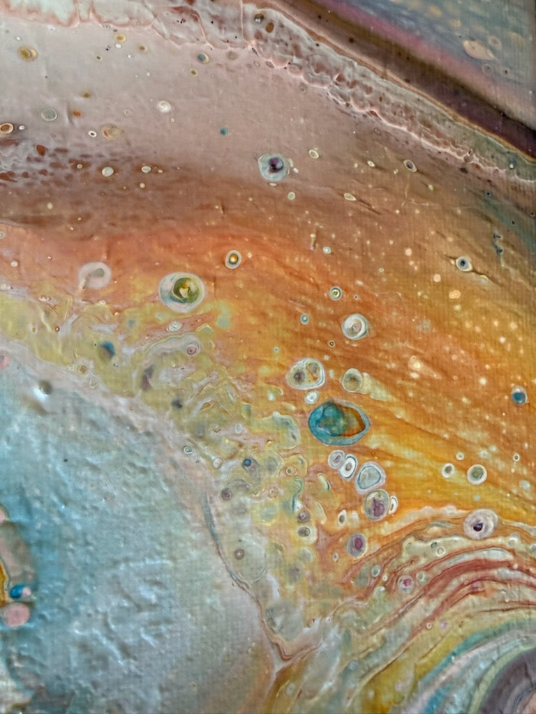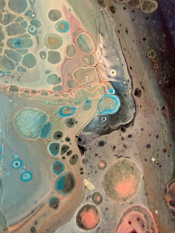 Soft blush tones, airy neutrals, and flowing layers of teal, gold, and muted berry weave together in gentle movement, while delicate cellular details invite a closer look. This piece carries the same emotional warmth and sense of ease as its larger counterpart, but in a quieter, more personal scale.