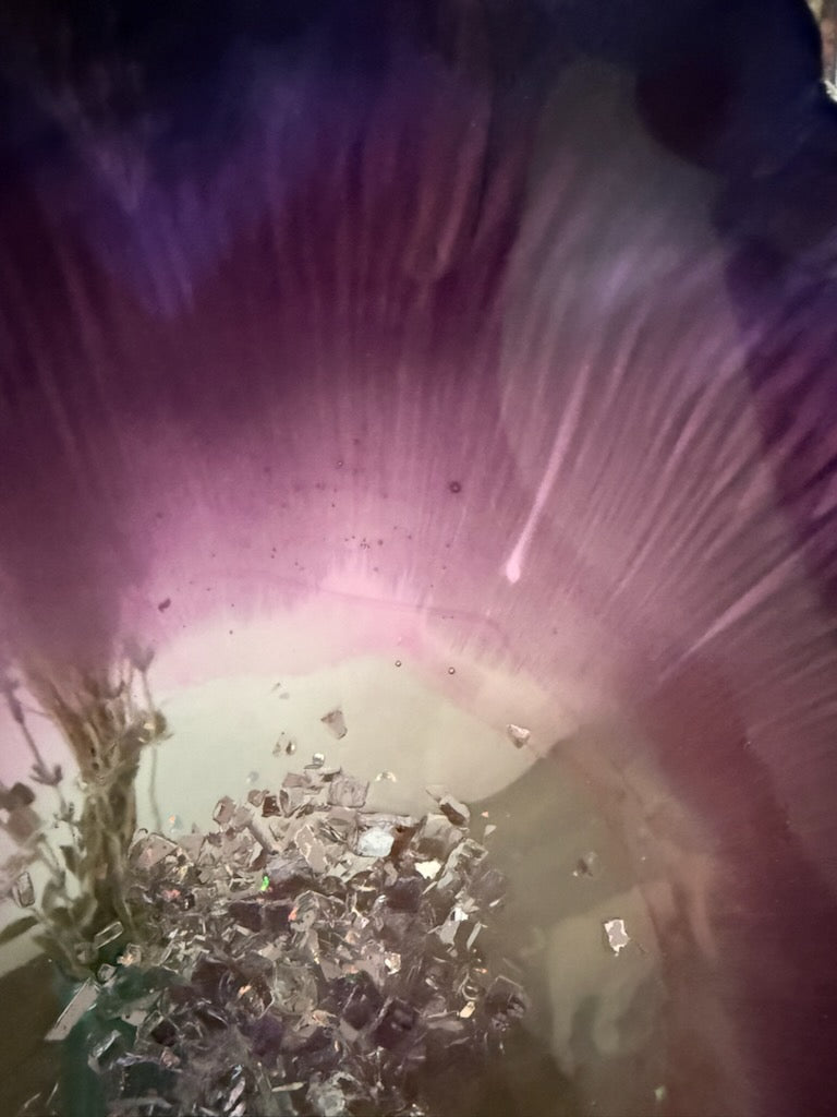 Deep violet and soft blush tones swirl together in this one-of-a-kind resin bowl, fading into a glowing center sprinkled with crushed crystal detail. Amethyst Halo was created to feel like a quiet moment of calm — the kind of light you find after a hard season, when your heart finally gets to exhale.