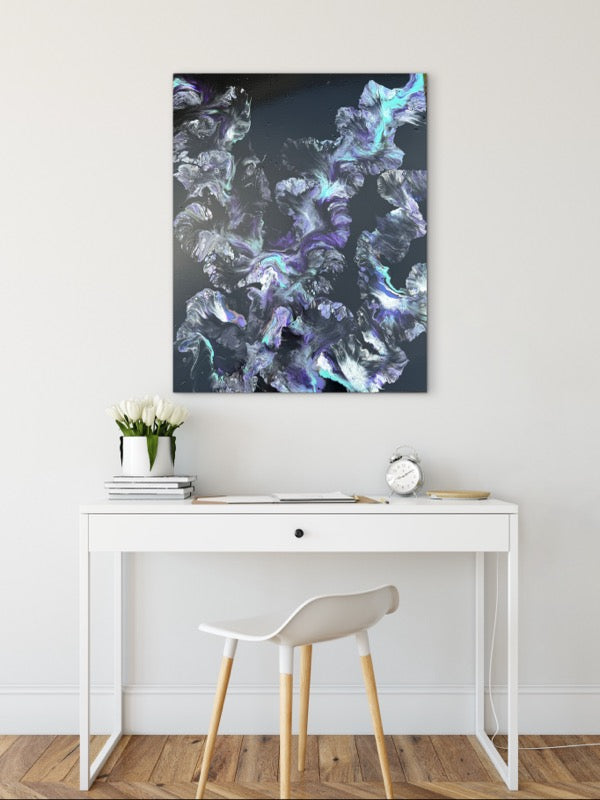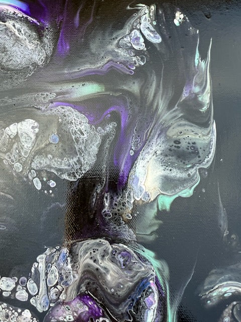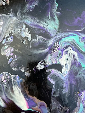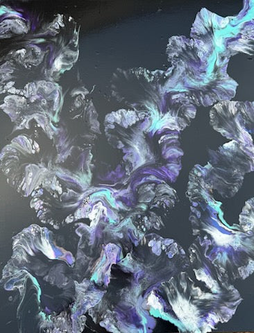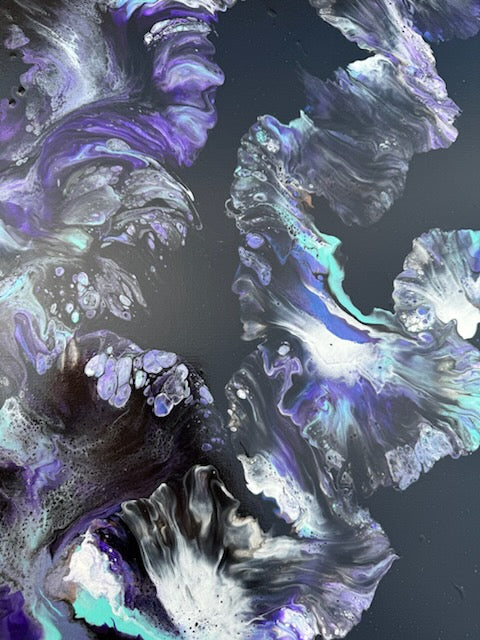 This piece lives in the deeper hours — the quiet moments when the weight feels heavier, the thoughts grow louder, and the world narrows. Layers of inky charcoal, deep violet, and teal emerge and recede across the surface, like emotions rising and folding back in on themselves. There is tension here, but also tenderness.