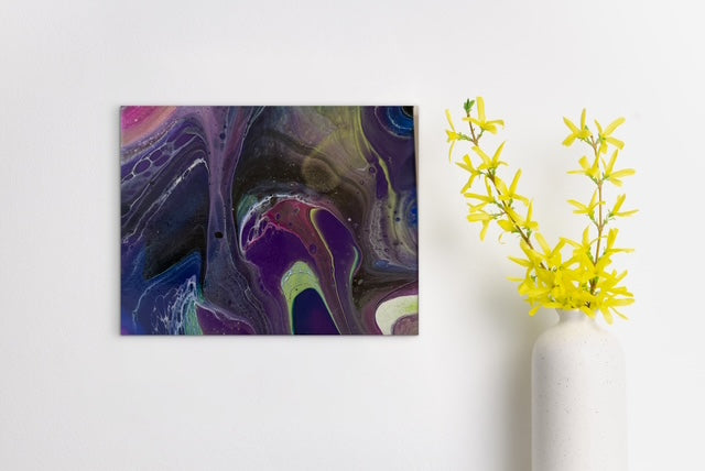 Deep, layered hues of purple, pink, green, and black mingle across this small canvas, reflecting the ebb and flow of thought and feeling. The piece holds a gentle tension between darkness and light, encouraging the viewer to pause and explore their own inner landscapes.