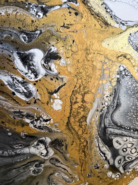 A bold piece where shadow and shimmer collide. Deep black waves move across the canvas like uncharted waters, while veins of radiant gold and bright white push through with brilliance. The contrast of light and dark captures the tension between struggle and breakthrough, inviting the viewer to see beauty in both the chaos and the calm.Â