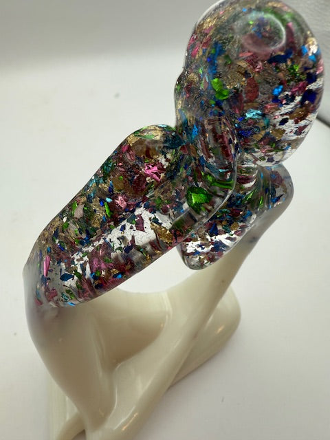 The smooth ivory base grounds the piece, while the upper form is filled with layered, multicolored fragments suspended in resin. Each fleck reflects a moment, a feeling, or a piece of a story—proof that even when life feels scattered or overwhelming, it can still be held with care.