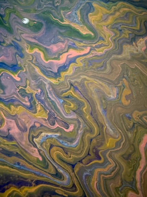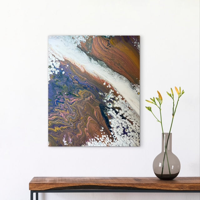 This 20x24 painting embodies the tension between chaos and clarity. Deep swirls of purple, bonze, and gold represent the storm of emotions we carry, while a bold river of white breaks through - a reminder that light and hope always carve a path forward. The layered textures and cellular details invite the viewer to reflect on resilience, healing, and the power of breaking through darkness.